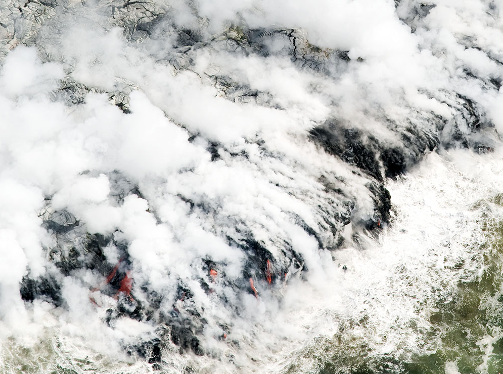 I captured the image posted below many years ago, while flying in an open-door helicopter over the lava fields of Hawaii. The image, “When Lava Meets the Ocean,” captures Pele, the goddess of volcanoes, at work. The fiery lava scorches the island, destroying everything on its way to the ocean. When it reaches the ocean, it solidifies and thus adds to the island.